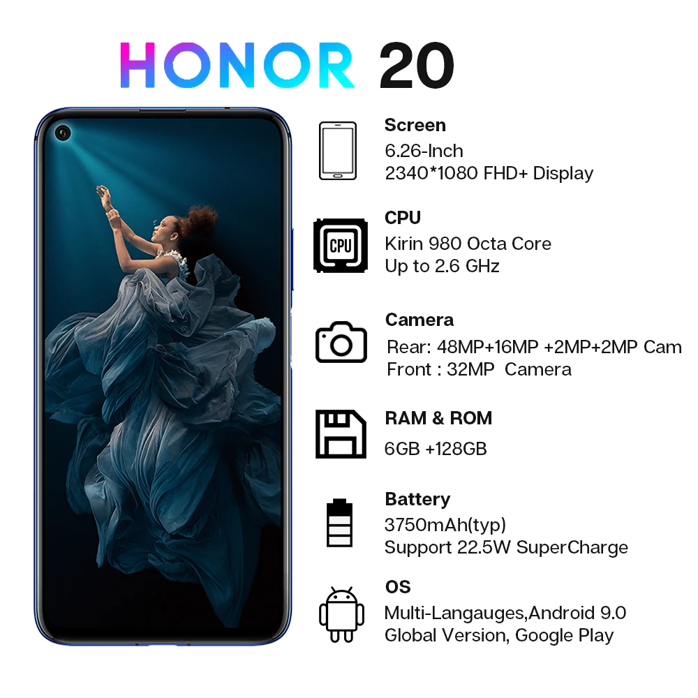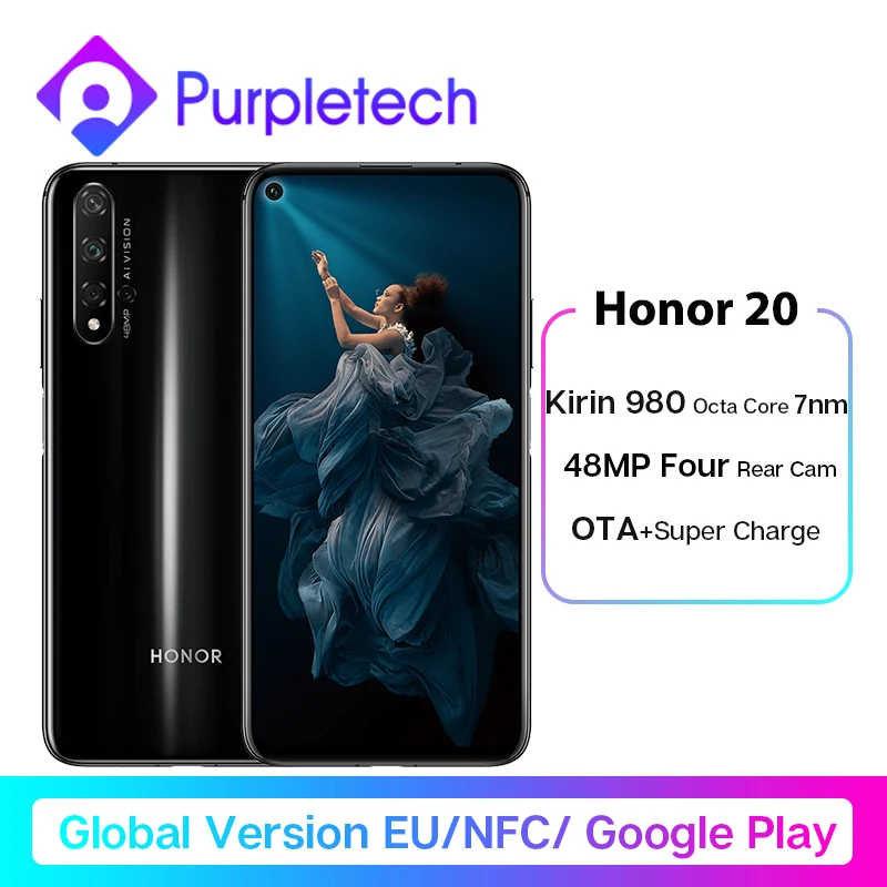 HOT SALE Global Version Honor 20 Smartphone 6G128G Kirin 980 Octa Core 6.26''48MP Four Camera Mobile Phone N
